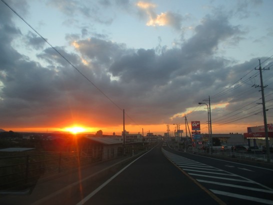 写真上: 本日の午後5時過ぎの夕映え(国道9号線走行中の車より)