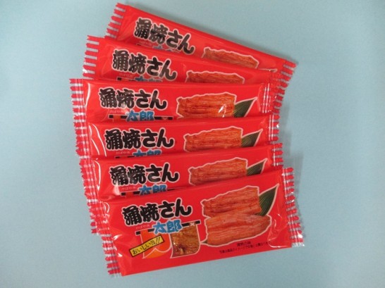 先日、どこかのテレビ番組を観ていたら、外国からの旅行客に人気の駄菓子を取り上げていた。1位は何だったか忘れたが、2位の「蒲焼さん太郎」というのが、とても旨そうに見えた。その晩すぐにネットで注文(30個入りが2パック入ったもの)したら、2日後ぐらいに送ってきた。で、その味は? なんせ1個10円の駄菓子。うなぎの蒲焼からはほど遠いが、焼酎のアテにはバッチリ! 久しぶりの「駄菓子」を楽しんでいる。写真の消しゴムは大きさ比較のため。(100円の、モノ消しゴム) この「菓道」というメーカーは、かなり良心的な会社のようで、「蒲焼さん太郎」の袋の裏側には【毎度お買い上げありがとうございます。私、蒲焼さん太郎はおさかなのすり身にイカ味を混ぜ合わせ、板状にのばしたものを食べやすいようにカットしてオーブンで焼き上げました。その後みりん、醤油、七味等で味付けして蒲焼風に仕上げました】と書いてある。わずか10円の駄菓子にこれだけ懇切丁寧な説明書き! 感心した。 写真下の記述は、ウィキペディアの記事をコピーして貼り付けたもの。