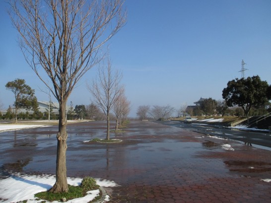 昼前の散歩、外気温11℃にて数日前とえらい違い。陽光も「春のきざし」でふんわか。このまま春になってくれればいいのだが…。まだ2月が控えているので、それは無理だろうが、少なくとも寒波襲来だけは、お手柔らかにお願いしたいものだ。 (写真上: 総合公園の広場も雪が溶けてうらうら)