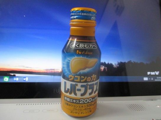 昼前、散歩に出かけるとき、少し喉が渇いていたのでコンビニへ。ふと見ると、棚にドリンク剤がいっぱい。特に多いのが「飲み過ぎに効くウコン何とか」という肝臓に効くというドリンク。その中でも、ズバリ「レバープラス」というのが目についた。ご丁寧に肝臓の写真まで付いているので、思わずゲット。税込350円はちょっと高いが、それだけ効くのだろう。(ほんまかいな???)