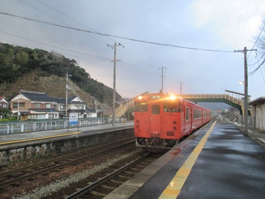 写真上: 浜村駅へ入って来る普通列車と、その車内。宮崎駿の「 千と千尋の神隠し」の、湖の中を走る電車のシーンを思い出した。