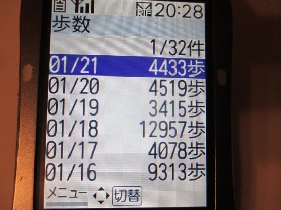 本日、各地で3月上旬の陽気だったとのこと。我が鳥取県でも11~12℃まで上昇。室内暖房を忘れるほどであった。だが、体調はイマイチ。数カ月ごとに痛む右足の膝がズキズキ。この程度なら「歩きながら治す!」と散歩するのだが、寒い季節なので自重。この数日の動向が表われているケータイの歩数計(写真上)。右足くるぶしの痛みが薄れて、「散歩再開」したのが18日。その夜に右ひざが疼いて、翌日から自重。正式の歩数計ではなく左ポケットに入れたケータイなので、実数より3~4割増しぐらい。ということは18日は8000歩ほど。その前後は2000歩ほど。今日などはコンビニへ出かけただけで、ずっとデスクワーク。階下から2階の自室へ何度か往復したのが唯一の運動だった。