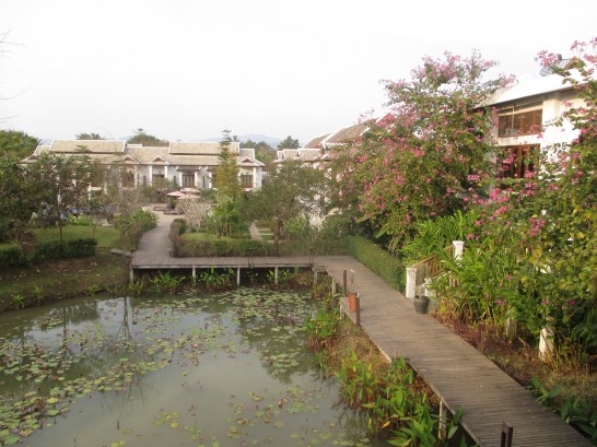 写真下: ルアンパバンのホテル中庭。ブーゲンビリアが咲き乱れ南国情緒たっぷり。私の部屋は正面。昼の最高気温は31℃。真冬の鳥取からいきなり初夏の太陽、という気分で、寒がりの私には最高のひとときだった。朝夕は涼しく、夜は15℃ぐらいまで下がるので、エアコンを切って快適に眠れた。