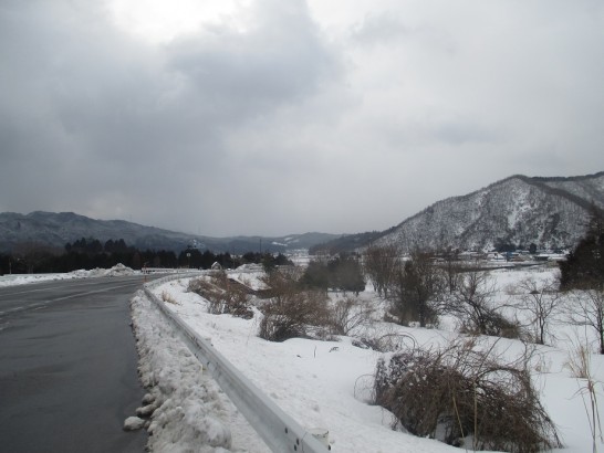 写真1:犬狭トンネルを出た岡山側の雪の状況。畑にはあるが路面はゼロ。写真2枚目:帰路、落合ジャンクション手前で鮮やかな虹(写真ではイマイチだが…)