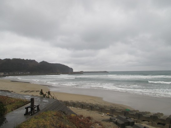 写真上: 帰路、寄り道して八束水海岸へ。波頭激しく、海はまだ真冬の様相だった。