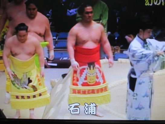 写真上: 十両に昇進した鳥取県出身「石浦」の雄姿(赤い化粧まわし)。 連日、自分より20㎝も背の高いのや、30キロも重たいのを相手に、懸命に頑張っているが、昨日の取り組みで太腿?を傷めたらしく、本日は持ち前の粘りの片鱗もなく、あっさり負け。これで3勝3敗。極めて厳しい土俵になってきたが、早く快復して頑張ってほしいものだ。