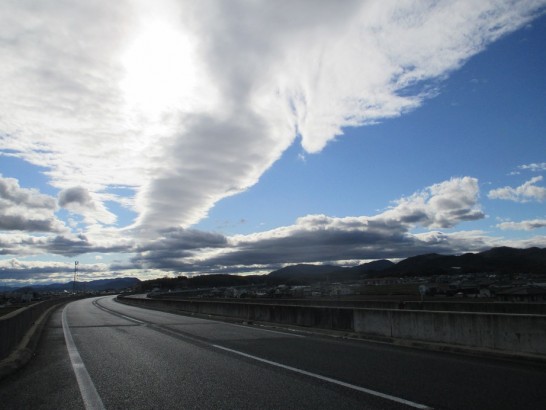 写真上1: 帰路の岡山道にて。雨も上がって、雲がおもしろい様相を呈していた。