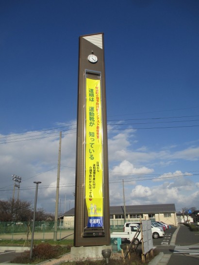 本日、町役場の前を通りかかたら、掲示塔に「道順は運動靴が知っている」という川柳がぶら下がっていてチョッとびっくり。これは去年、町が募集した「介護予防川柳」の応募句の中から、選者5人(私もそのうちの1人)で協議してトップに選んだもの。句は良いが、分かち書きが不満。作者名がないのも不満だが、出す方が良いのかどうか? 背景の建物は役場ではない。役場は新築して片田舎にしては立派。