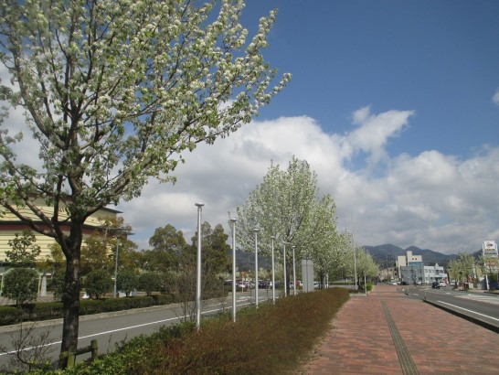 写真は、【倉吉未来中心】前の街路樹。「桜か?」と思ったが、桜にしては白いので表示を確認したら「マメナシ(トゥーリィ)」となっていた。とても爽やかな花だった。 (先ほど調べたら、三重県ではイヌナシとも呼ばれているらしい)