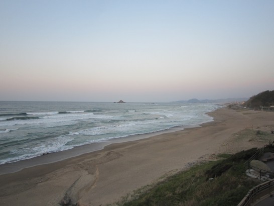 写真上から。帰路の加西SA「仲のいい椅子」。「いい季節になりましたね~」「居眠りする前に休みましょうね」と言っていた。次の2枚も帰路、午後6時40分頃の白兎海岸。陸橋から東を見ると、まだ明るくて浜辺は明確に見えた。波はかなり荒かったがサーファーの姿はなかった。西を見ると鮮やかな夕日で、岩礁がシルエットになっていた。