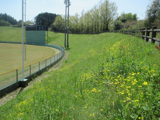 そうです。この黄色い花がいっぱい咲いている場所は野球場のフェンスの外。「春の色」とでもいうのでしょうか、緑と黄色が目に沁みます。