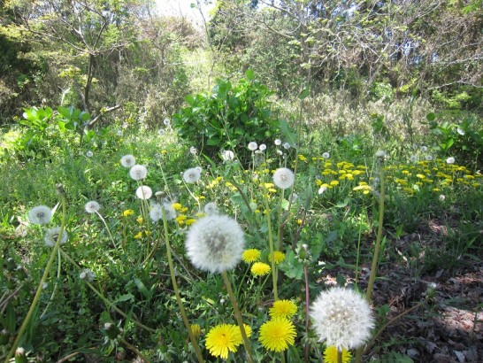 全国的に快晴だった本日。山陰もフェーン現象なのか、鳥取市で29,3℃とのこと。琴浦町でも28℃まで上がったのではないか。寒がりの私も昼前の散歩では、途中から上着を脱いで、シャツを腕まくりして初夏のスタイル。散歩道の新緑も美しく(写真上)、ベストシーズンの到来である。2枚目の写真は、総合公園の「私の桜」のうしろで見つけたタンポポの綿毛。すでに飛んでいたのもあるが、きれいな球形のがいくつも並んでいた。