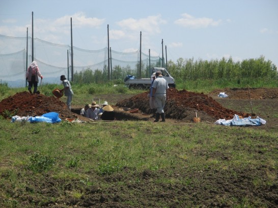 数日前から散歩道の横に車がたくさん止まっていて、この畑の主と同じ集落の皆さん、と思しき方々が穴を掘っている。その大きさは、幅2メートル、長さ5メートルほど。今日、通りがかると、穴の深さが腰より上になっていた(写真2枚目)。それも3か所。はてさて、何の穴なのだろう? 訊ねてみたいが、道路より少し入っているので、声をかけられず写真を撮っただけ。いずれ、確認したい。背景の柱は、ゴルフ練習場のネットのポール。この練習場も廃業。モトクロス?の練習場になる? と聞いているが、まだ何の動きもなし。