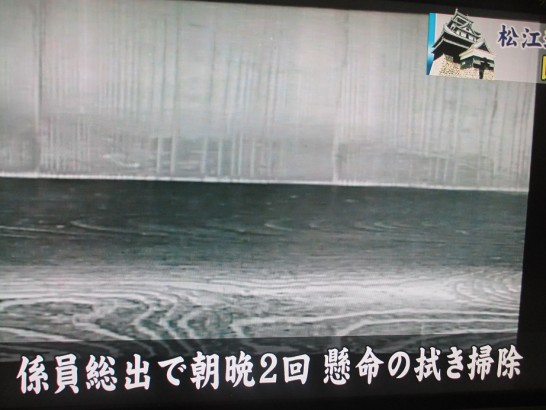 今夕、晩酌をやりながらNHK総合ニュースを観ていたら「松江城天守閣が国宝に指定」というニュースが出て来てビックリ! 慌ててカメラを取りに行ってパチパチ撮ったのが上の写真。関係者はずいぶん前から申請して、地道な努力を続けていたらしい。その真摯な気持ちと生真面目な姿勢に心から敬意を表します。松江城の天守閣には1~2年に1度ぐらいの割合で登っている。昨年も島根県川柳大会だったか松江川柳大会だったかの休み時間に汗をかいて登楼。天守の風が爽やかだった。全国の皆さん、松江は歴史ある観光都市ですが、松江城が国宝に指定されたことによって更に人気が出てくることでしょう。天守閣に登る体力のあるうちに是非おいでください。(もちろん、エスカレーターやエレベーターはありません。磨り減った急な古びた木製の階段です。登る際にはくれぐれもご注意を!)