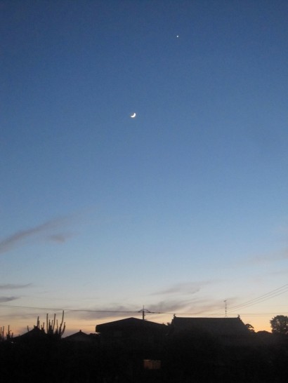 写真: 帰路の定点観測「考える椅子」。「いい季節になりましたね。居眠り運転にはくれぐれも気をつけて!」と言っていた。その下、車に忘れたカメラを取りに駐車場へ行ったとき。ふと見ると綺麗な三日月と1番星だった。時刻は午後7時35分。