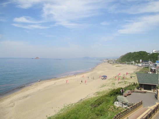 写真上: 定点観測、うぶみ川柳会からの帰途、午後3時40分頃の白兎海岸。若者たちがネットを挟んでラケットで何か打ち合っていた。バトミントンのような感じがしたが、打っているのはシャトルではなくボールのようだった。先ほどネットで調べたら「ビーチテニス」という新しいスポーツのよう。知らんかったな~。興味のある方は「ビーチテニス」で検索してください。動画が出てきます。この動画を見ると、コートの周囲に大売出しの旗のような幟旗を立てている。これは、浜風の強さや方向を見るためのものではないか(私の推定)。上の写真では、赤いのがその旗で、コートの周囲にあって目立っていた。旗が1本だけでないのは、「ここでやっていますので、旗から中へ入らないでください」というテリトリー表示の意味もあるのかもしれない。