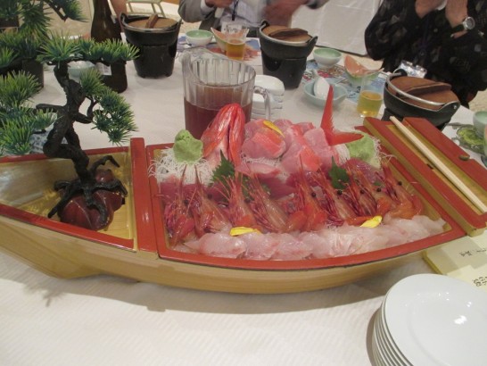 前夜祭の参加者は300名近く? 大勢の方々とご挨拶。翌日の大会では670名?もの出席ということで、ここでもたくさんの方々とご挨拶。合計で100名以上と「こんにちは~」「おひさしぶりで~す」を繰り返したよう。写真下は宴会での舟盛、「銚子の海の幸」。ビールで乾杯後は清酒&焼酎湯割りの三種混合ガンガン。注ぎに来てくださいました皆さん、ご挨拶いただきました皆さん、サンキューベリマッチ!でした。おかげさまで楽しいひとときでした。まだ続きを書こうとしましたが、もう11時30分。猛烈に眠くなってきましたので、続きはまた明日です。