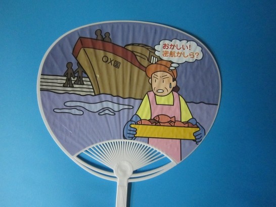 読んで思わず笑っちゃいました(^^;) 確かに日本海側では不審な漂流物や 漂流船のニュースを聞く事が有りますが、街の中でも不審者を多く見かける ニュースが増えている様な気がします(>_<) 街中でも欲しい団扇ですね(-_-;)