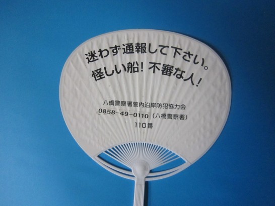 今日も梅雨空で涼しかったが、散歩して帰るとムシムシ。手元のウチワを使っていてフト見たら写真上のようなもの。瀬戸内海側とか太平洋側ではあまり見かけないと思うが、こちら山陰の海岸沿いには、いたるところに「不審者を見かけたら通報してください」という看板がある。で、私を知らない人から「不審者!」と誤解されてもいけないので、誤解される恐れ大いにあるので…、最近、海岸周辺は散歩コースから外している。