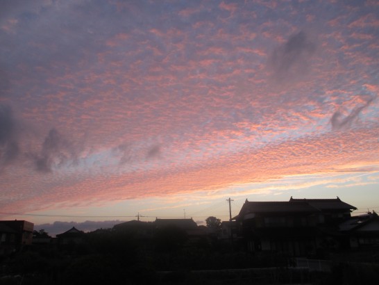 写真上: おしんに入りかけてふと見上げたら、凄い鱗雲。パチリと撮って、おしんに入るとKちゃんとSちゃんがいたので、「ちょっと外に出て!」と見せたら、ほろ酔いの2人も「おお、きれいなあ~!」と感嘆していた。