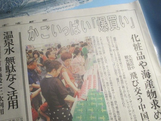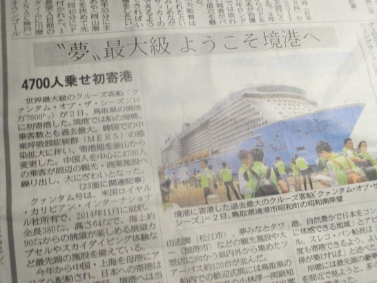 中国人の観光客による「爆買い」などは、こちら鳥取の田舎では無縁だと思っていた。ところが、昨日、世界最大級の豪華客船「クァンタム・オブ・ザ・シー」(16万7800トン)(米国、ロイヤル・カリビアン・インターナショナル社所有)が、境港に寄港したから大騒ぎ。予定では寄港地は韓国の「釜山」だったそうだが、例のMERS騒ぎを嫌って境港にしたのだという。中国人を中心にした観光客は4700人。観光バスが120台も港へ集結して、大型店や観光地へ案内したらしい。中でも、イオンモール日吉津(米子市に隣接した巨大マーケット)では、商品をいつもの2~3倍、レジーも増やして対応したらしいが…。うわさ以上の「爆買い」によって、たちまち列をなしたのこと。中国パワー恐るべし。(写真、いずれも、今朝の日本海新聞の記事)