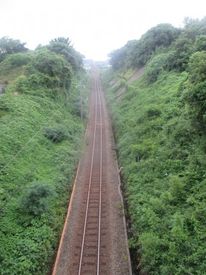 この跨線橋は、初めて渡りました。八橋小学校への通学路で、普段は近くの畑の人ぐらいしか使用していないようです。私がいた5分ほどの間でも、誰にも会いませんでした。まるで、宮崎駿のアニメの世界に入り込んだような気分でした。今度、時刻表を見て、列車を上から映してみましょう。