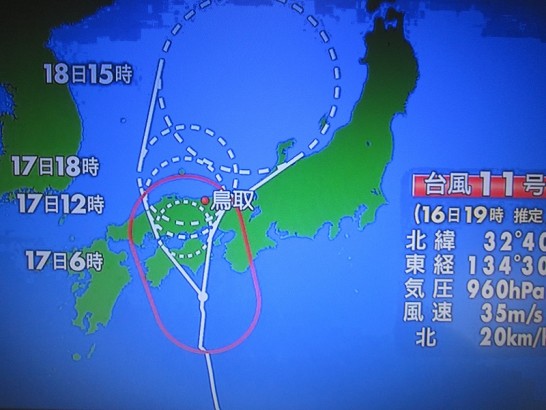 写真上: 台風情報。どうも明日の昼頃に鳥取県を横断しそうな状況。みなさ~ん、充分に注意してくださ~い!