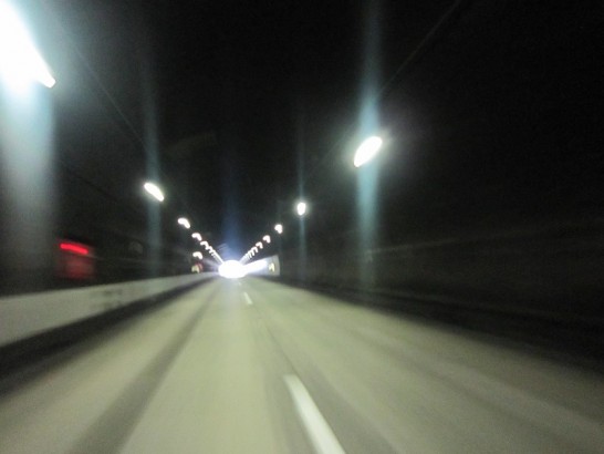 写真その次: 帰路の擂鉢山トンネル。全長4100メートル。中国地方で2番目に長いとのこと。この写真は出口近くにて、対向車もいなかったのでパチリ。