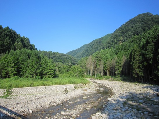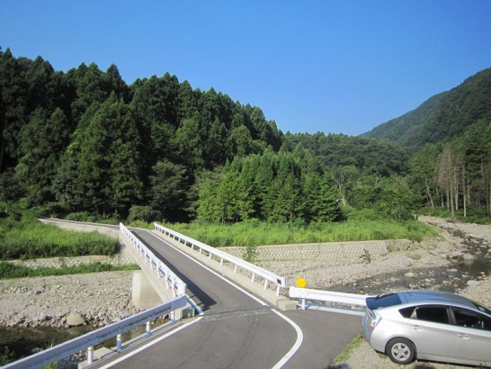 写真: 山小屋真下の一向橋(いっこんばし)。数年前、古い橋が洪水で流されて建て替えられた。橋の向こうに田圃もあったが主が亡くなって耕作放棄地になっていて、集落の人もあまり通らず、1日に数台。日本で通行量の少ない橋ベスト10に入るだろう。