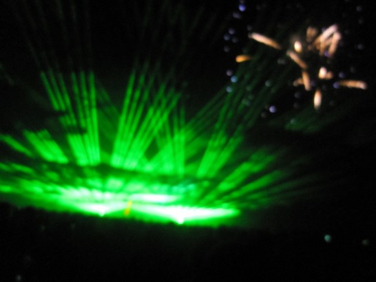 晩酌で焼酎ガンガンやっているときは「これから公園まで20分も歩くのか、面倒だなあ」と思いましたが、出かけて良かったです。レーザー光線は小高い丘から観客の頭上めがけて飛んできます。ジャズやポピュラーソングをアレンジした軽快な音楽が大音響でシンクロ。その上で花火がバンバン揚がるので迫力満点でした。
