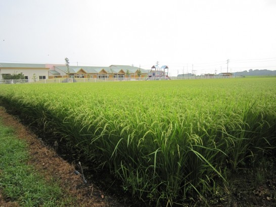 写真上: 店番のため昼前の散歩ができないので、早朝散歩。早く植えたのか早生なのか、もう稲穂の頭が垂れていた田圃があった。背景は八橋こども園。