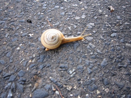 写真次: ムカゴを写した後、道路で見つけたカタツムリ。このままでは車に轢かれると思って草むらに移してやった。虫の嫌いな人もいるかも、と思ってアップしなかったが、先ほど、のりこさんのコメントを見て、あまりにも偶然だったので、敢えてアップ。