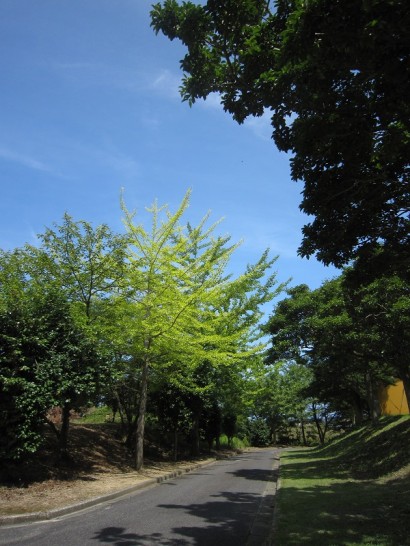 写真:本日、昼前の散歩にて。総合公園内の遊歩道、公孫樹がほんのり色付いていた。