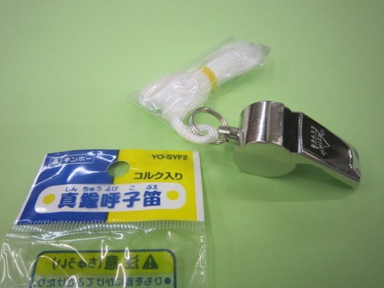 写真2: 当店にずっと昔から置いている金属製の笛。商品名は「呼子笛」(よびこぶえ)とは、何とまあ古めかしい。1年に1個か2個ぐらい売れる。