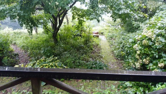 写真1 :雨の庭。好天なら、写真の突当りのバーベキューコーナーでやる予定だった。