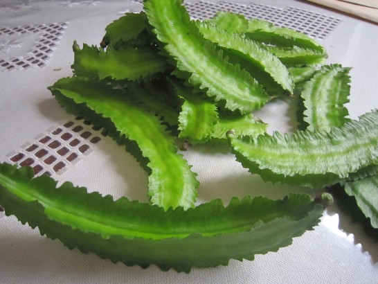 「シカクマメ」←まったく、そのままの名前でチョッと笑いました。豆は、このムカデのようなギザギザがついたのを丸ごと食べます。天麩羅では大きすぎるので、二つ切りか三つ切りにして揚げていました。旨かったですよ。テレビの字幕で紹介しているように、傷みやすいので、全国には流通していないと思いますが、見かけたらチャレンジしてください。