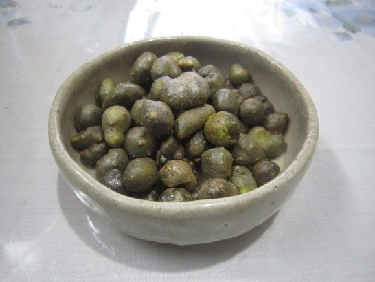 写真2:そのとき収穫したムカゴ。時間がなかったので、酒のアテ1回分ほど。ムカゴを入れている器は、20年ほど前、陶芸に嵌まり込んでいたときの私の作。肉厚で不格好だが壊れにくいのが取り柄。