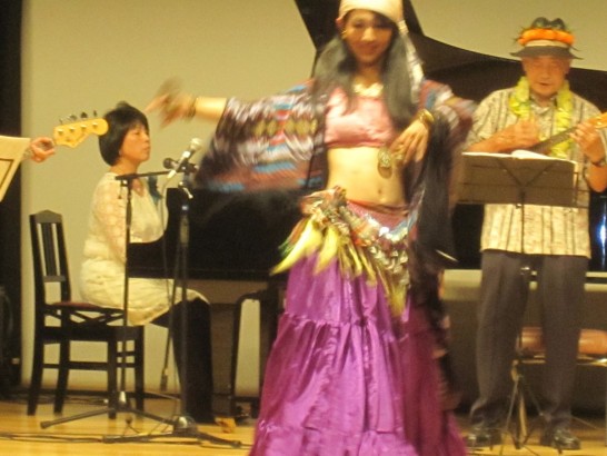 写真下 : 岡山県大会のアトラクション「ベリーダンス」。投句を済ませて外出。岡山駅近くのイオンまで行ってぶらぶら。少し買物をして1時前に会場へ戻るとアトラクションのベリーダンスをやっていたのでパチリ。アトラクションが済んで、ロビーでコーヒーを飲んでいたら主催者から「二次選者を」と依頼あり。あわてて楽屋裏へ。二次選者メンバーは地元の川柳協会会長&副会長等3名。県外からは蘭幸さんと私の計5名。各題の特選句から「岡山県知事賞」や「岡山市長賞」などを選考。無事に選考終了したときには課題3つの披講が終わっていた。後で訊いたら「ふわり」で佳作に入っていたとのこと。