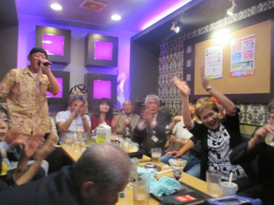 写真2: カラオケで熱唱する奇蹟の男、鰹さん。