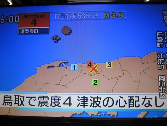 午後6時前に鳥取県中部を中心にした地震がありましたが、当方まったく被害などありませんので他事ながらご休心ください。