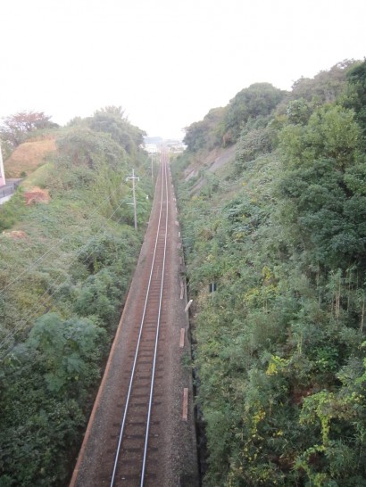 ムカゴの話ばかりで恐縮だが、このシーズンの散歩はムカゴが採れるところを中心に歩いている。今夕の散歩も、「あの辺りに蔓があった」と思い出した小学校の通学路へ向かう。国道9号線の歩道から細い坂道をテクテク登って、また細い道を歩いて、出てきたのがJR山陰本線の跨線橋(写真上は跨線橋中央から東に向かってパチリ)。橋を渡ってムカゴを採っていたら、林の向こうから下校する子供たちの声がワイワイ。この道は地元の人たちもほとんど通らない通学専用路のようなもの。薄暗くなりつつあったし、「変なおじさん」と思われるのも嫌なので、見つからないうちにUターンして退散。