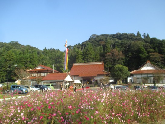 写真1 秋晴れの下。コスモスに祝福されて佇む医光寺。