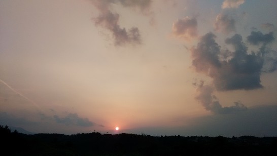 写真上 :本日夕刻の夕映え。沈む太陽はメチャ大きかったが、その大きさは、私の腕とスマホでは掴み切れなかった。