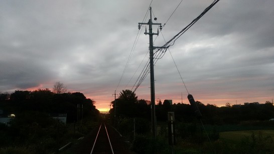 写真上 :本日夕刻の散歩にて。夕焼けと山陰本線。