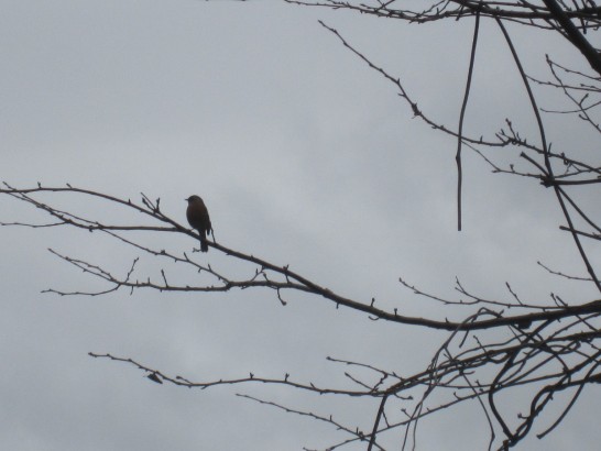 写真: 久しぶりに昼前の散歩。総合公園の「私の桜」で雀が1羽、曇天を背景に冷たい風に吹かれていた。ふと 今日は何食べた日暮れの寒雀  松井一寸 を、思い出した。