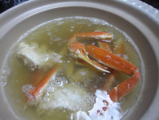 昨夜6時から、勤務時代の仲間たちと忘年会を兼ねた年に1度の「松葉蟹フルコース」。場所は賀露港の「まつ○ら旅館」。メンバー10名。横浜1人・佐世保1人・鳥取1人・他は大阪&兵庫。5時半に着いたら、もうスルメとかオカキで酒盛り中で完全に出来上がっているのが1人。「今からそんな調子ではカニ食われへんやろ!」と言ったとおりになった。写真上: 蟹の刺身から始まって、焼きガニ、鍋、そしてシメの雑炊まで。食べきれないほど。小ぶりのマツバは食べきれないので全員持ち帰り(写真4枚目のもの)。