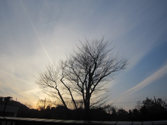 完司先生おはようございます。寂しそうな冬の夕空きれいですね。裸木が頑張っているのも冬ならではのもの。これから春へ春へ夕日も変身していくのが楽しみです