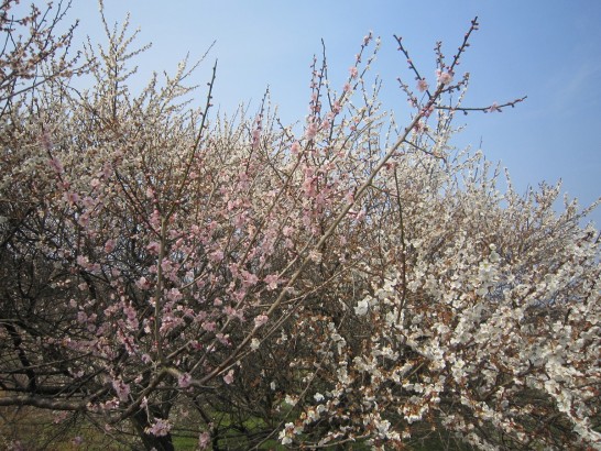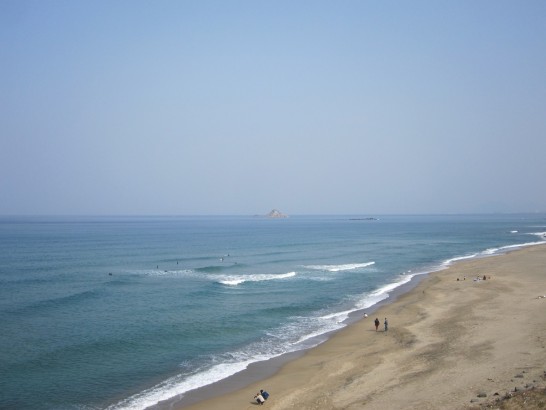 写真上: 1つ目。うぶみに出かける前の散歩にて。久しぶりのパワースポット「東伯第3跨道橋」から米子方面を見る。良い天気だったが少し霞んでいたのは黄砂だったのか? 2つ目。この跨道橋近くの梅林。白っぽい花が多い中で、ピンクが濃い花がひときわ美しかった。3つ目。会場への往路。定点観測の白兎海岸。サーファーがたくさん波と戯れていた。砂浜にシートを敷いて寛いでいた人もいたが、サーファーの仲間かもしれない。