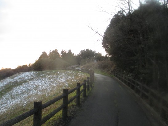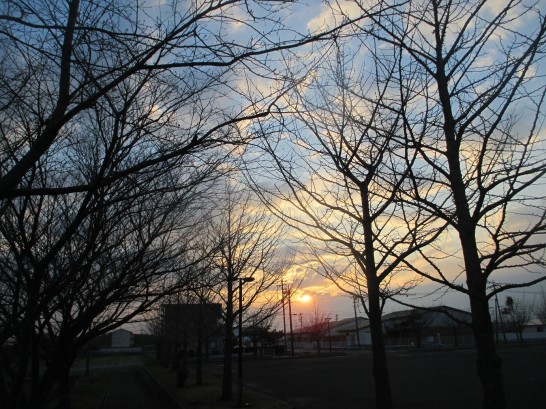 目覚ましの世話にもならず4時30分に目が覚めたが、鼻はスッキリ。膝は少し痛かったが愛用のサポーターでカバーして出かける。5時30分より結跏趺坐。足の先がギンギンに冷えて痛かった。終了後いつものように般若心経、ミニ法話。終ってから別室にてお粥・お漬物・茶菓子・お茶を頂戴してしばし談笑。本日の参禅はフルメンバーの12名。7時前に辞去。帰路、総合公園へ寄ってハーフコース散歩。 写真: 総合公園駐車場から見た朝日。遊歩道の横には昨日の雪が残っていた。