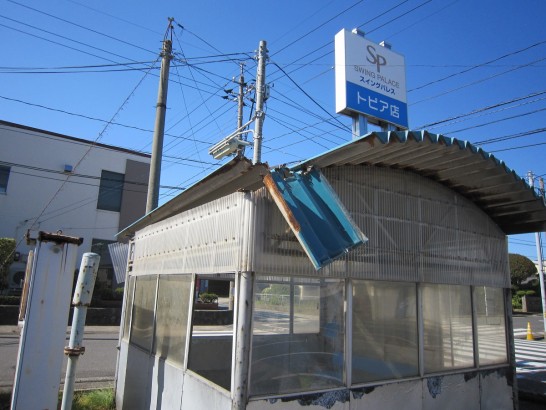 バス停。そうですね、言われて見れば大きい。そして古い! 中にベンチが3つほどあるようです。これはバス会社のものではなく、農協の所有なのかもしれません。(敷地が農協マーケットの駐車場内なので)
